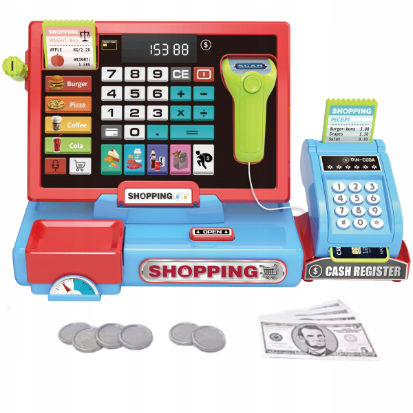 Что бы ребенку было интересно играть с кассой и он мог сразу организовать процесс работы магазина Вы можете дополнить покупку наборами овощей, фруктов, продуктов, хлеба, а так же весами - ребенок будет с удовольствием взвешивать овощи, фрукты и продукты перед продажей и пробитием на кассе.