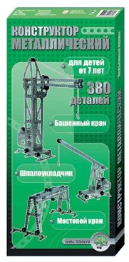 Конструктор металлический кран состоит из 434 деталей, из которых можно собрать по предложенной схеме 3 варианта: Башенный кран, мостовой кран и кран-шпалоукладчик.