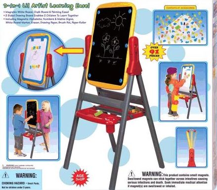 Вращающаяся доска удобна тем, что ребенку не нужно ходить вокруг мольберта: захотелось рисовать мелом - повернул доску, закрепил и можно рисовать. Возникла необходимость складывать магнитные буквы на белой поверхности - повернул доску в обратную сторону, снова закрепил - и можно работать. Поворотная доска дополнительно заинтересует ребенка.