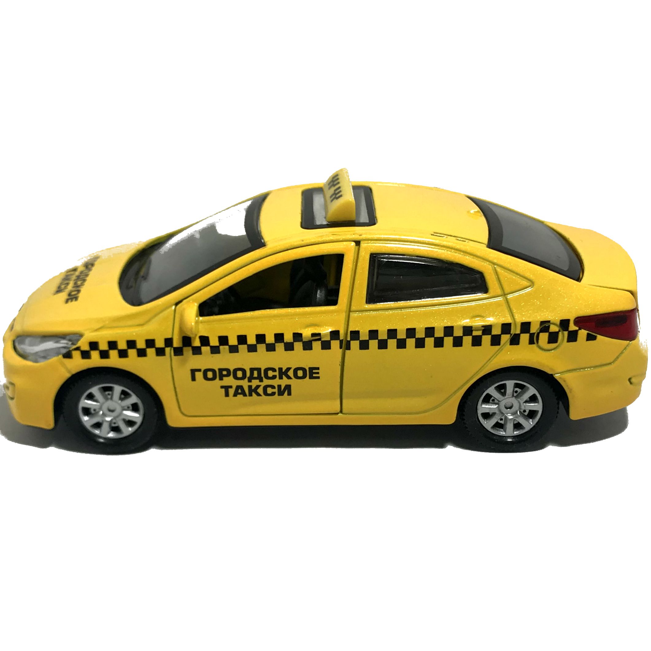 Игрушечная машинка Hyundai Solaris такси с металлическим кузовом, Длина - 12 см, с 3-мя открывающимися дверьми и инерционным механизмом.