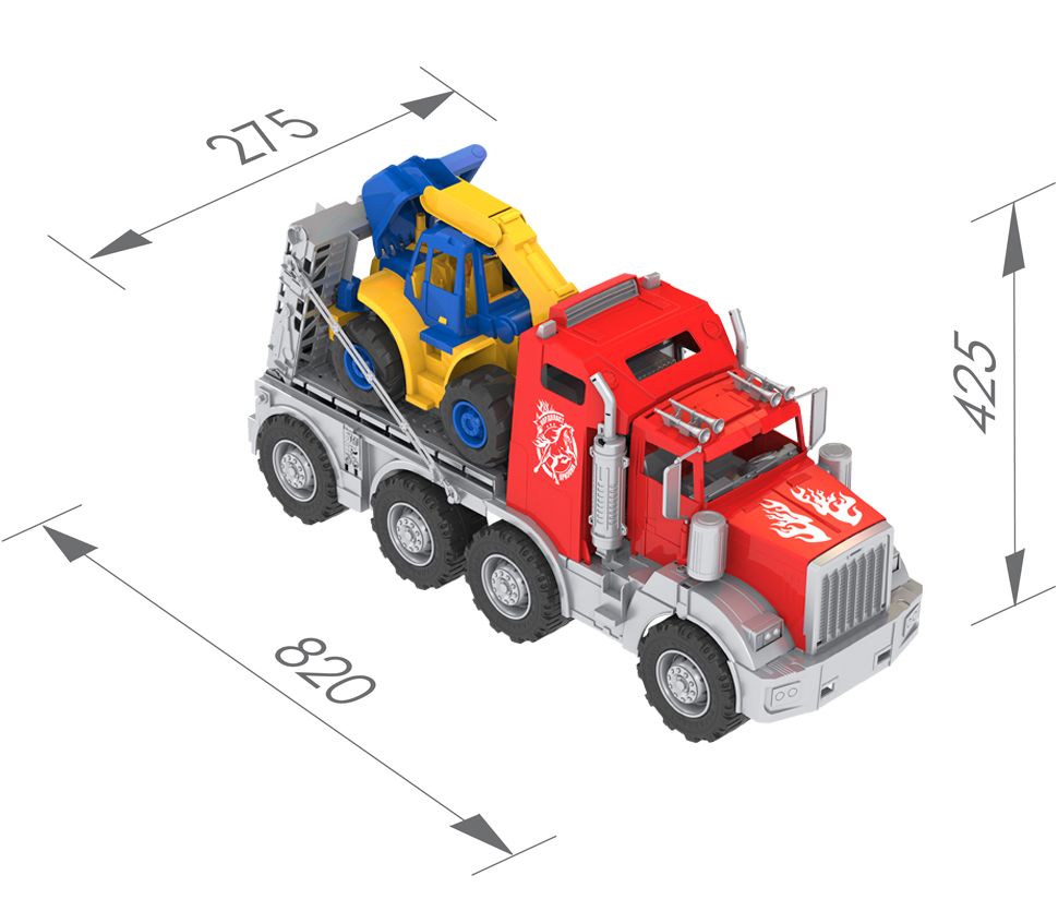 Игрушка перевозчик тракторов - это гигантский трейлер с трактором погрузчиком на платформе. Он сделан из качественной пластмассы. Сам трейлер - настоящий великан, ведь его длина - 82 см, ширина - 27,5 см, а высота - 42,5 см. Это новая серия российских грузовых машин-гигантов, прообразом которых стали знаменитые американские тягачи-дальнобойщики, известные детям по мультфильмам и эпизодам кино. Детский перевозчик - тягач изготовлен из яркого блестящего пластика. В кабину можно посадить любую фигурку - водителя (или солдатика)! Сзади погрузочные мостики-салазки для заезда и спуска техники откидывается назад. У платформы потрясающий объем - можно перевозить огромные машинки!