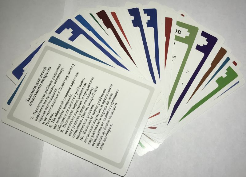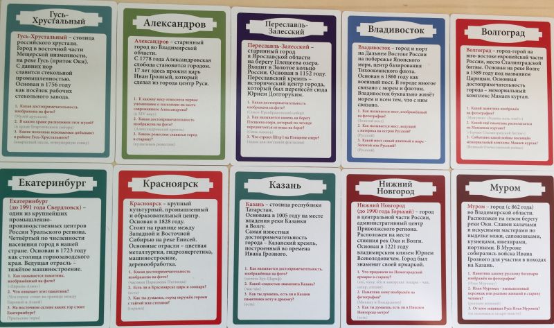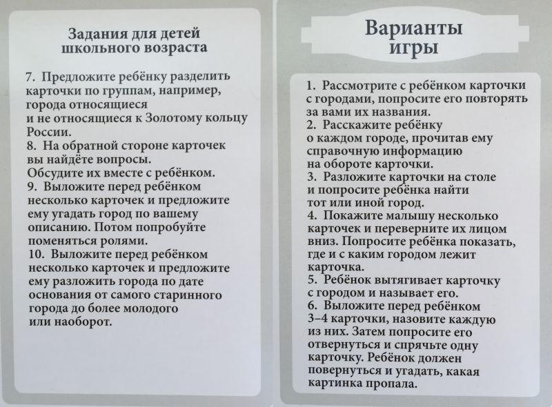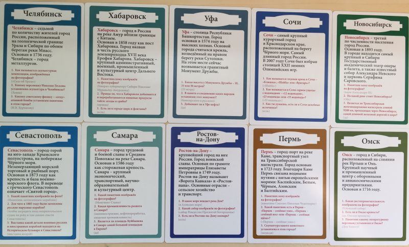 Игрушечная энциклопедия в карточках — это не просто игра, это игра-учебник. Педагоги и многие другие специалисты трудились над ней, чтобы ваши дети знали географию, историю и культуру России, любили свою Родину и гордились ей. Энциклопедия в карточках будет способствовать достижению прекрасного учебного результата. Игра разработана с учетом современных игровых технологий в образовании и направлена на развитие всех познавательных процессов, расширение и углубление предметных знаний, формирование общеучебных умений и навыков. Материал - картон. Всего в наборе 36 карточек, 35 из них с названиями городов и их достопримечательностями на обороте, 36 же карточка так называемый перечень правил игры.