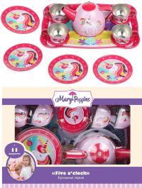 Детская металлическая посуда из 14 предметов на 4 персоны включает в себя чайные чашки с блюдцами, чайник с крышкой, поднос и еще 4 тарелки. Посуда металлическая. Она вдохновит ребенка на разыгрывание различных сюжетов по чаепитию с куклами и зверятами. Набор упакован в красочную коробку, размеры (ДxВxШ): 25 x 9 x 17 см.