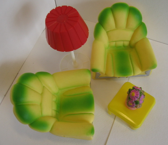 Набор мебели Уют-2 состоит из двух больших резиновых мягких кресел, пластикового стола с вазой с цветами и пластикового торшера. Данный набор мебели подходит для оборудования "домика для куклы".