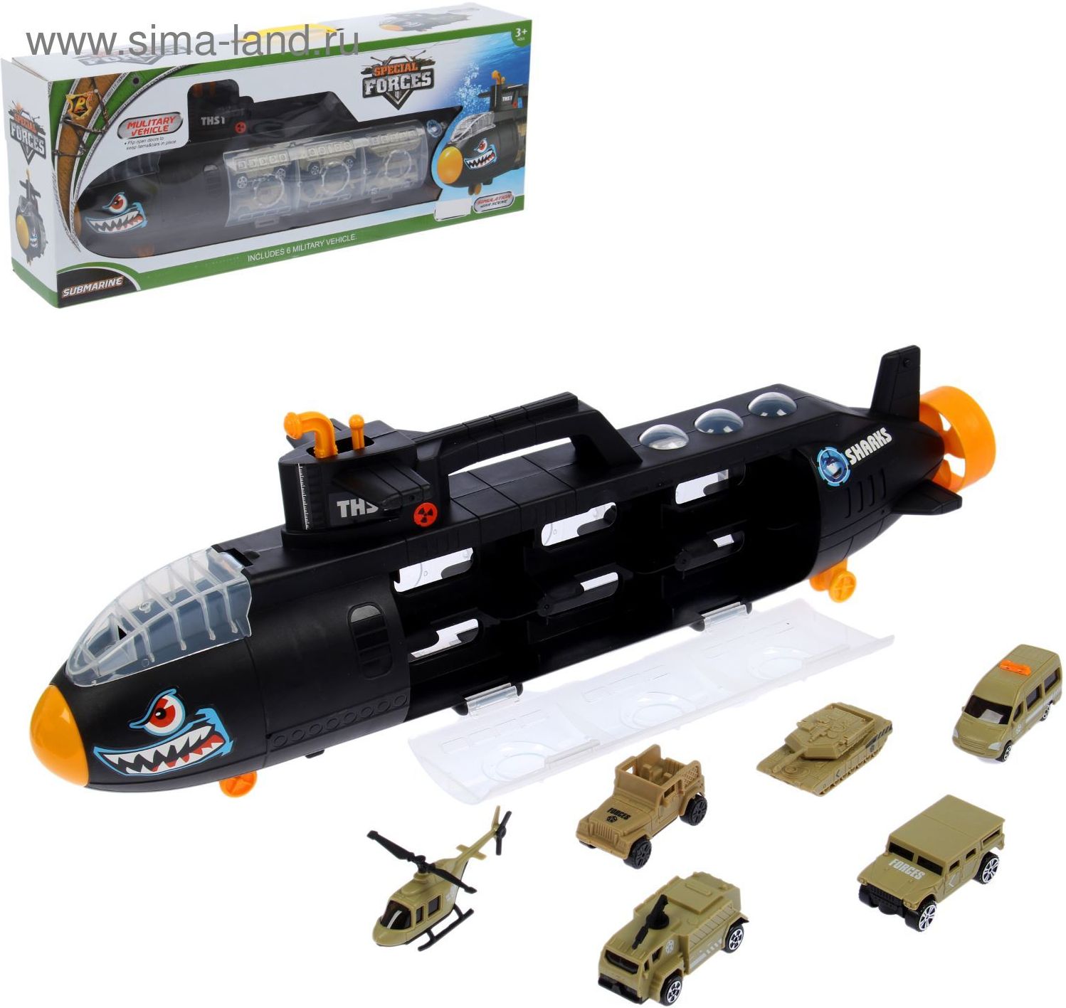 Игрушечный паркинг подводная лодка сделана из пластмассы. Парковка «Подводная лодка» выполнена в виде субмарины с ярким дизайном. В её грузовой отсек помещается сразу 6 транспортных средств. Прозрачная боковая дверца надёжно закрывается. Длина лодки - 54 см, Ширина - 8 см, Высота - 18 см. Корпус - пластмассовый. Есть инерционный механизм. Размер упаковки 58x11x23 см. Для детей старше 3 лет.