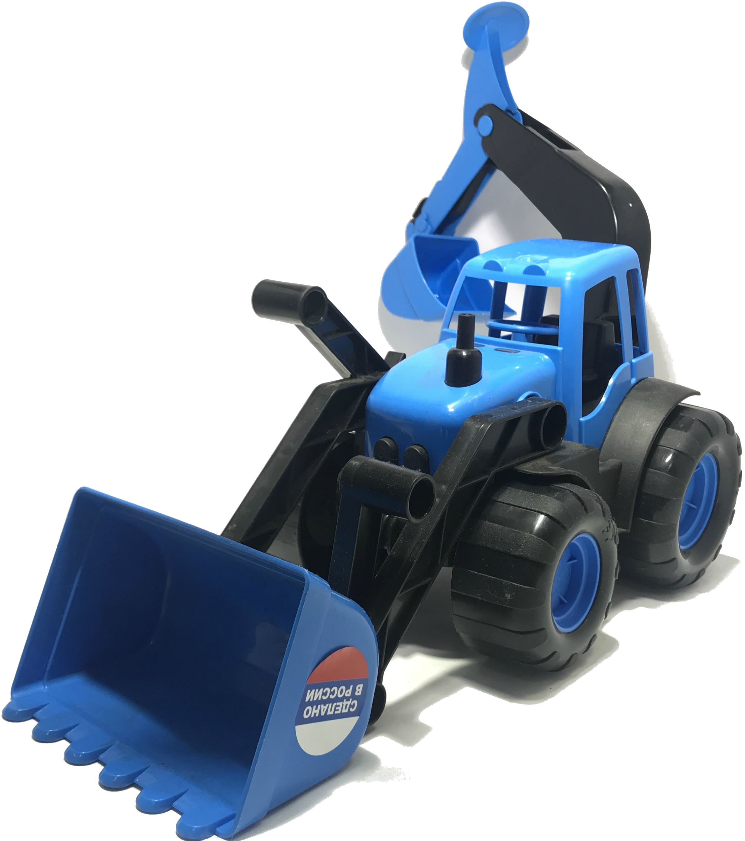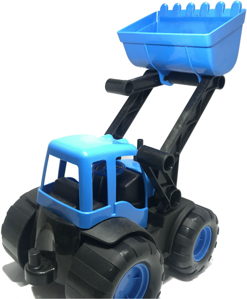 Игрушечный большой детский трактор может грести лопатой песок или снег, а может ковшом копать ямку (котлован) в песочнице. Детский трактор изготовлен из высококачественного пластика. Длина трактора (по корпусу) - 21,5 см, длина трактора с навесным оборудованием - 45 см, ширина трактора - 16 см, высота трактора - 15,7 см. Детский трактор экскаватор за счет своей многофункциональности является одной из самых популярных среди детей игрушек тракторов. Детский трактор спереди имеет лопату длиной 8 см, которая поднимается вверх и опускается вниз, а сзади на рукояти с возможностью выворачивая размещен ковш, которым можно копать ямку в песочнице. И ковш и лопата управляются специальной ручкой. Лопату сзади можно снять с трактора.