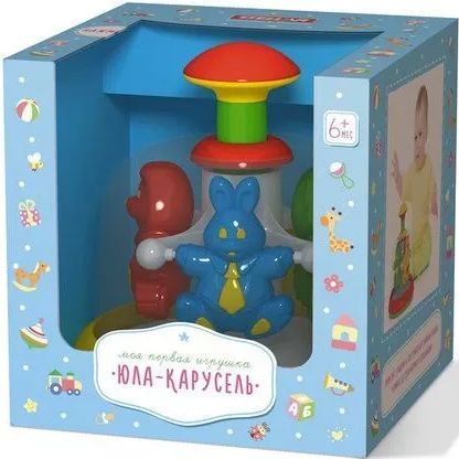 Юла карусель с котенком и обезьянкой внутри кружатся яркие разноцветные фигурки, а заводится она от легкого нажатия на рукоятку. Играя с юлой, малыш учится видеть закономерности, которые нам, взрослым, кажутся столь очевидными и незначительными, а для малыша являются настоящими открытиями!