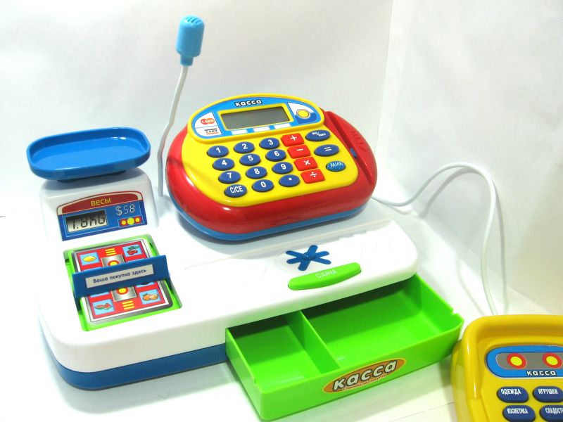 На отдельном терминале 6 кнопок с названиями товаров - при нажатии на них - произносится название товара и на экране кассы появляется цена. При нажатии на кнопку "Вопрос" задаются вопросы на знание цифр и нужно нажать на меню калькулятора правильный вариант.