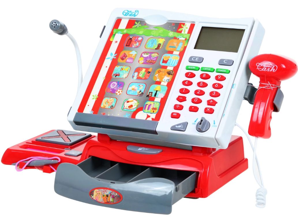 Касса с сенсорной панелью имеет большое пано-меню с нажимными знаками, ж/к (черно-белый) экран для отображение цифр и классические кнопки калькулятора.+ есть сканер с хорошим пиканьем и подсветкой.