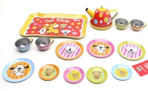 Детская металлическая посуда - это набор на 4 персоны, который включает в себя 14 предметов: 4 чайные чашки с 4-мя блюдцами, 4 большие тарелки, 1 чайник и 1 поднос. Посуда металлическая. Она вдохновит ребенка на разыгрывание различных сюжетов по чаепитию с куклами и зверятами.
