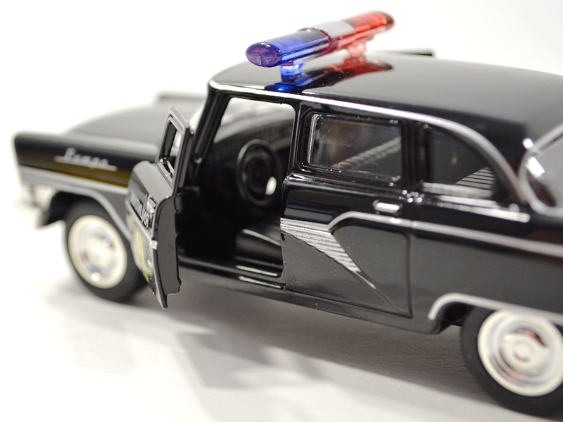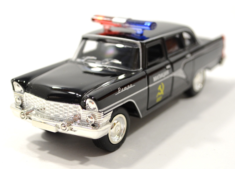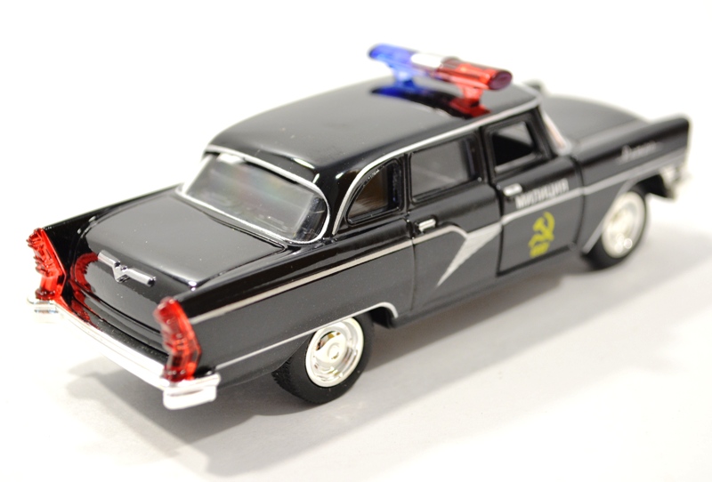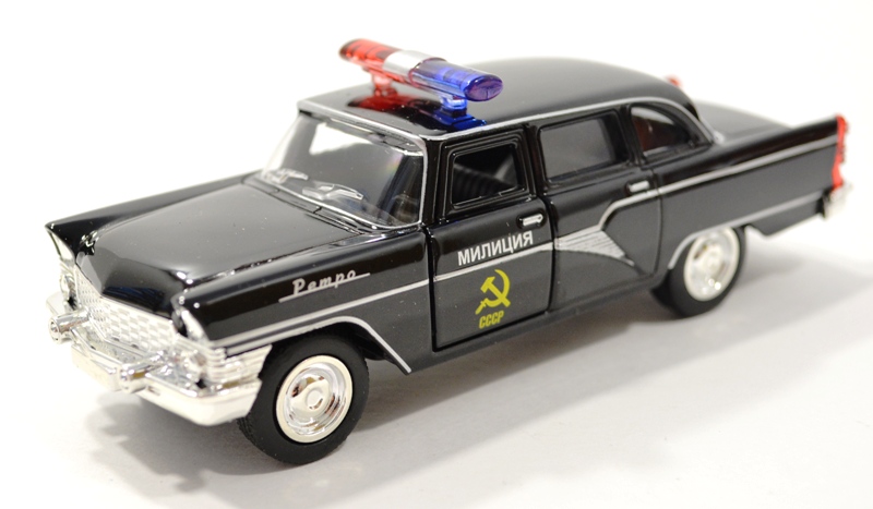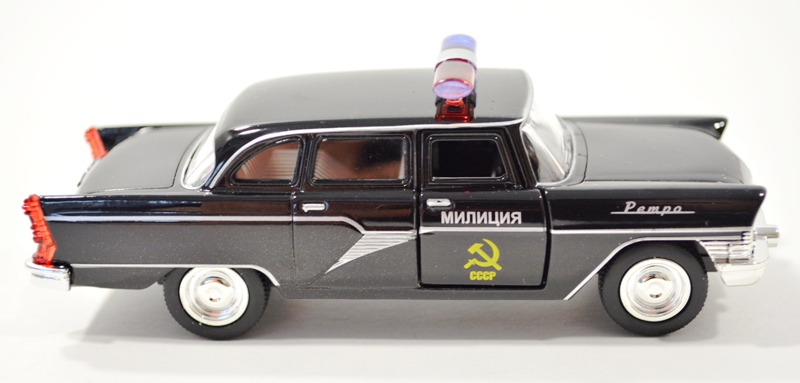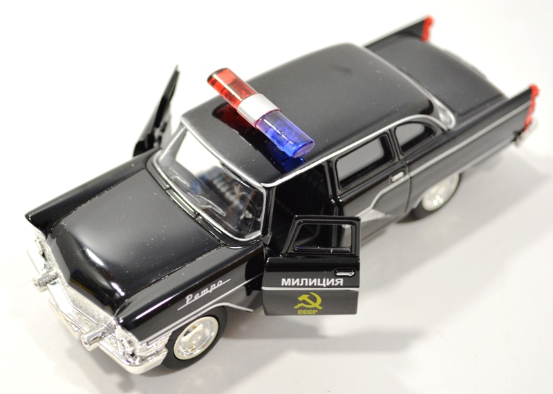 Игрушечная модель Ретро автомобиля Чайка представлена в черном цвете с серебристыми вставками и надписями: Ретро и Милиция СССР. У автомобиля открываются 2 передние двери. Машинка имеет инерционный механизм, при взводе которого автомобиль может ехать сам. Игрушка выполнена в масштабе 1:48.