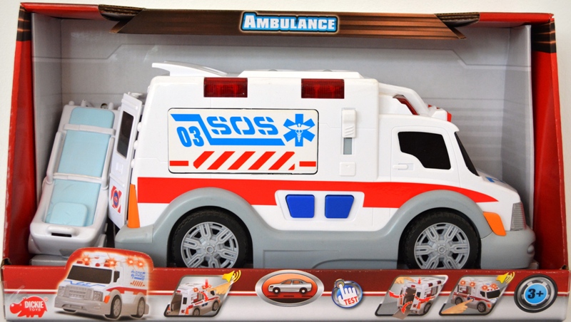 Машинка Скорая Помощь Simba Dickie в наборе с носилками на колесах. Машинка функциональная: звучит сирена, горят фары, открываются задние двери, сбоку открывается люк, опускается подъемник по которому можно завести каталку-носилки.