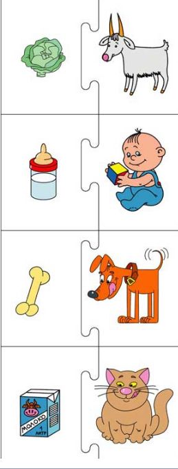 Задача: подобрать парные по рисунку картинки: кошке-котенка, корове-теленка, курице-цыпленка. Но сначала картинки разъединяются и перемешиваются. Теперь ребенку нужно подобрать парные по ассоциации картинки. От ошибок страхует соединение по типу пазла - соединить можно только парные картинки!
