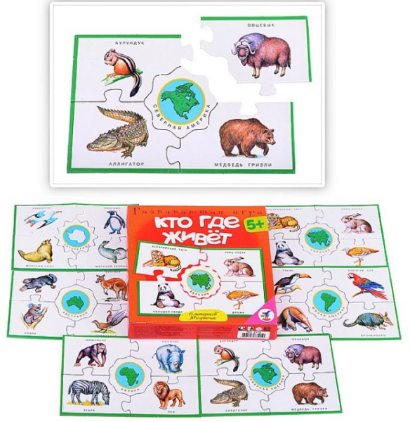 Логический пазл для детей Кто на каком континенте живет? из 6-ти материнских картинок с изображением континента Земли. К каждой материнской картинке нужно подобрать 4 карточки с животными, которые обитают на этом континенте. Во время занятия с ребенком можно задавать вопросы как про животных (например, как называется животное? Какие у животного особенности? Где живет? Какие звуки издают?)