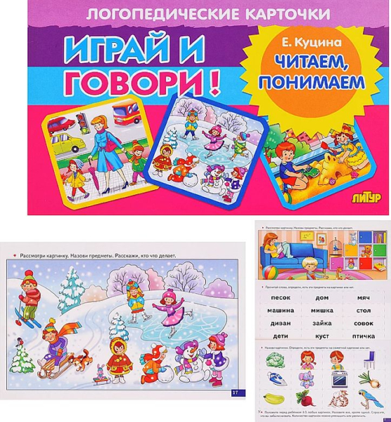 Логопедические карточки. Читаем, понимаем. Работая с данным набором карточек, ребенок учится воспринимать сюжетную картинку, вычленять ее части, находить конкретные предметы. Важно научиться осознанно отвечать на вопрос - "да" или "нет", а также составлять правильное предложение, ориентируясь на сюжет. Например: "Девочка несет сумку?" - "Нет. Девочка несет листочки". Работая с предметными картинками и словами, ребенок определяет, есть этот предмет на сюжетной картинке или нет. В процессе занятий с карточками у ребенка развивается зрительное восприятие, внимание, словесно-логическое мышление, связная речь. Предложите ему составить предложение с парой картинок. Например: "Девочка и кошка". Может быть, у вас получится несколько вариантов. (Девочка играет с кошкой. Девочка гладит кошку. Девочка кормит кошку. Кошка сидит у девочки на коленях и т.д.) Используя этот набор карточек, поиграйте в игры "Чего не стало?", "Что изменилось?", "Подпиши картинку" (прочитав слово, нужно найти соответствующую предметную картинку).