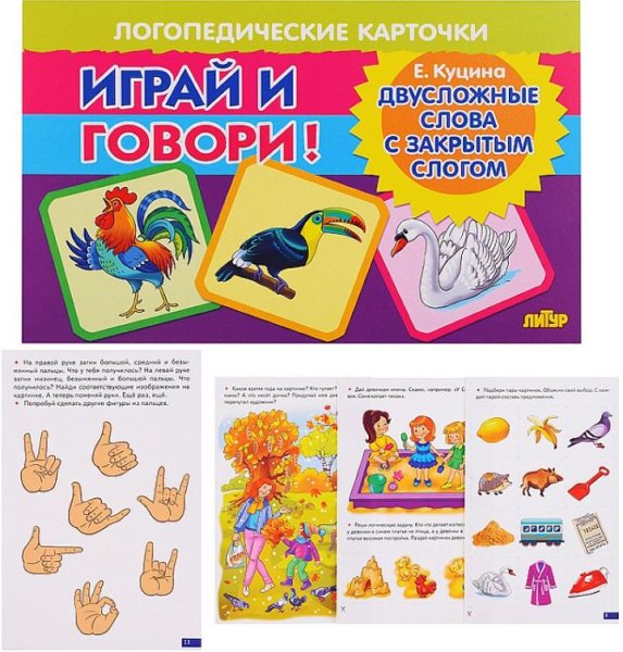 Пособие предназначено для детей, начинающих говорить. В карточках подобраны задания, насыщенные словами 4-й слоговой структуры - это двусложные слова с закрытым слогом: палец, пакет, халат, салат, ежик, лебедь, петух, лимон, голубь, тюлень, диван, букет, билет, батон, банан, кабан, замок, утюг, вагон, паук, тукан, совок, песок, кубик. Для того чтобы ребенок запомнил слово, необходимо его повторить не один раз.
