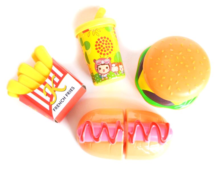Фастфуд еда на липучке из 8 предметов с тарелкой и разделочным ножом включает в себя 8 продуктов: напиток, гамбургер, картошку фри, мороженое, торт на тарелке, хот-дог, пирожное, булочку. Также в наборе предусмотрены: нож для резки и ложка для еды. Все детали пластмассовые. Благодаря креплениям-липучкам части продуктов можно отсоединить. Прекрасный материал для сюжетной игры в Макдональдс. Упаковка - блистер.
