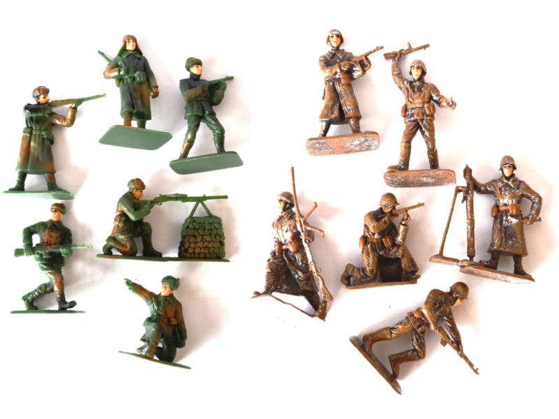 ** В наборе возможна инверсия цвета: те солдатики, что на фото зеленые - могут быть коричневыми, а те, что коричневые - зелеными.