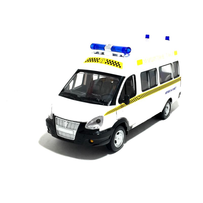Игрушечная Газель маршрутное такси имеет длину - 19,1 см, ширину - 7 см, высоту (от колеса до мигалки) - 9,6 см.
